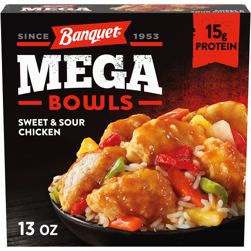 Bring exciting flavor to your table with Banquet MEGA Bowls Sweet & Sour Chicken. This frozen meal features large portions of white meat tempura chicken fritters, rice and vegetables topped with a tangy sweet and sour sauce for a delicious bowl that brings big flavor to the TV dinner aisle. With 15g protein per serving, this microwave meal is sure to satisfy. Perfect for lunch, dinner or anytime you're craving a hearty meal that's quick and easy to prepare. Stock up on your favorite Banquet MEGA frozen dinners for tasty meals that give you more to satisfy a MEGA appetite.