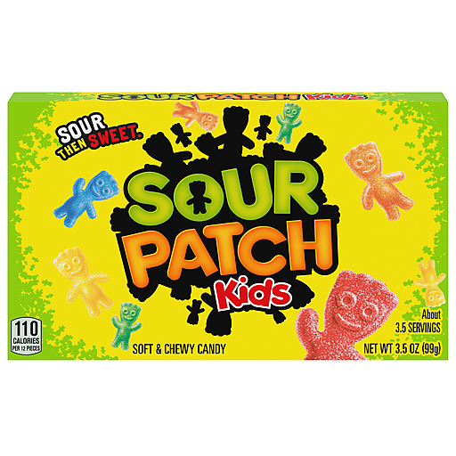 SOUR PATCH KIDS Soft & Chewy Candy packs all the classic flavor into a mischief-filled soft candy. Each fruit flavored candy contains red candy, along with blue, orange, yellow and green candy in signature assorted fruit flavors that create a SOUR THEN SWEET treat to satisfy your taste buds. Add a little fun to your candy experience with the unique kid shapes that give these candies their name. A fat free food, this sour treat is great for multiple occasions. Enjoy this candy whenever you want a SOUR THEN SWEET treat by keeping a package on-hand for quick sour gummy snacks or as party favors for Halloween, Valentine's Day or birthdays. SOUR PATCH KIDS soft candy also makes a great movie theater candy to snack on during your favorite flick. A fun alternative to bagged candy, this box of candy is the perfect size for stashing in purses, backpacks and lunchboxes. Stay stocked with sour candies so you're always ready for a snack.