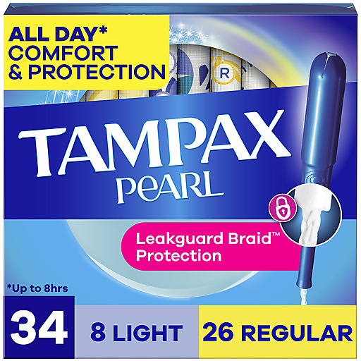 Say hello to up to 100% leak free periods with Tampax's Dual Protection System. Only Tampax has a LeakGuard braid that helps stop leaks before they happen. Plus, Tampax Tampons gently expand to fit your unique shape. Inserting Tampax Pearl tampons is made easy thanks to the applicator's Anti-Slip Grip. Get all day comfort and protection for up to eight hours with Tampax Pearl. Plus, Tampax Tampons are made with body safe* ingredients. Choose from five different absorbencies to match your changing flow. Leaking? Go up an absorbency. Uncomfortable to remove? Go down an absorbency. Tampax Pearl Tampons have a smooth comfort layer for easy removal, even on your light days. Tampax Tampons are made without perfume. Plus, Tampax products are OEKO TEX standard 100 certified, meaning they are tested for up to 1,000 harmful substances (Certificate #24.HUS.14474). Get incredible protection with Tampax, the #1 tampon brand recommended by U.S. Gynecologist (based on 2025 survey). Discover your perfect flow combo and get the protection you need. Tampax boxes are recyclable. *All materials meet FDA Medical Device biocompatibility criteria and are safe when used as intended. HOW TO INSERT A TAMPON: Slowly insert the tampon applicator from the tip, all the way to the grip, then push the pusher. After you've pushed the pusher in all the way, pull the applicator out. How to remove a tampon: You'll use your thumb and finger to grip the string and pull it slowly out. Properly dispose of your tampon in the trash.